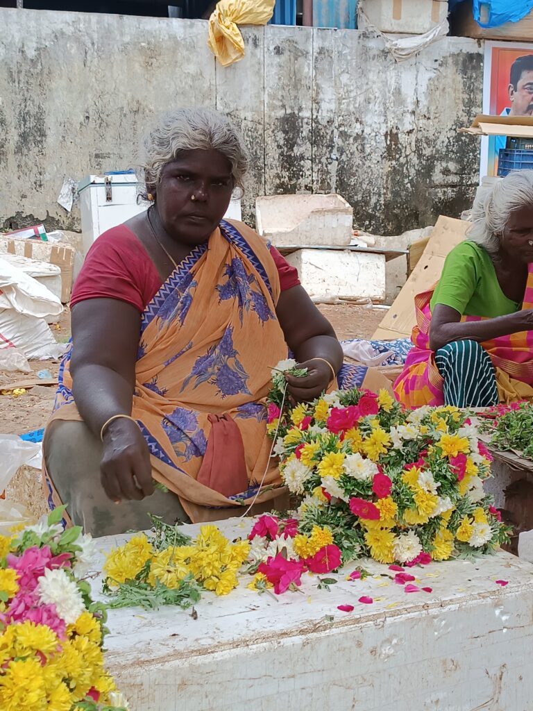 I fiori adornavano ogni angolo della casa, nonchè i capelli di Sarasvati: ogni mattina la madre di Sarasvati, un’anziana signora vestita con il tipico sari, raccoglieva dal giardino i fiori necessari per adornare gli altari e gli angoli della nostra residenza. Questo culto del fiore, come dono di bellezza al mondo, alla giornata, alla vita, mi ha molto affascianto, come il giorno in cui sono anadata a visitare il mercato dei fiori a Madurai: questa immensa distesa di sacchi piena di fiori di ogni sorta di colore e profumo, immagina quell’ordinata confusione tipica di un mercato affollato aperto 24 ore su 24, dove con genitlezza ti porgono una ghirlanda di fiori di gelsomino, il più pregiato per la cultura indiana. Quel profumo di gelsomino è inebriante, avvolgente, lascia la scia, lo appendi fra i capelli e ti senti bella come Parvati la bellissima compagna di Shiva.